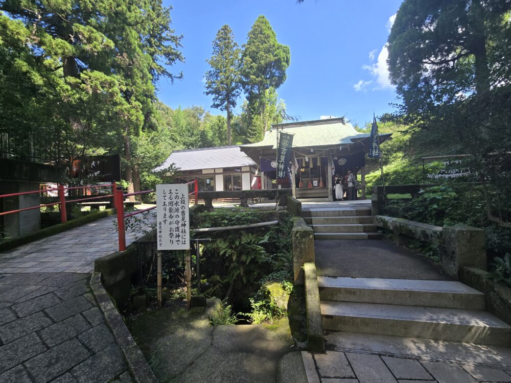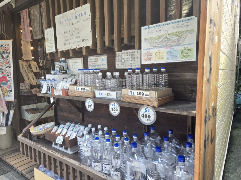 ということで早速すくってみた。ここでは毎分60トンもの阿蘇の水が湧き出していて水温は年中14度だという。手で触れるとひんやり。徒歩で汗をたっぷりかいたため、ひしゃくで頭から水をかぶってみたかったが、周囲を見渡すとやっている人がいなかったので自粛。その代わり、両手にかけてみた。こんこんと冷たい水があふれる景色と冷涼な空気だけでも十分に癒やされるが、この冷たさにはさらに癒やされる。初めて来たので四季ごとの感覚は分からないが、14度の水はおそらく冬場はとても温かく感じるのだろう