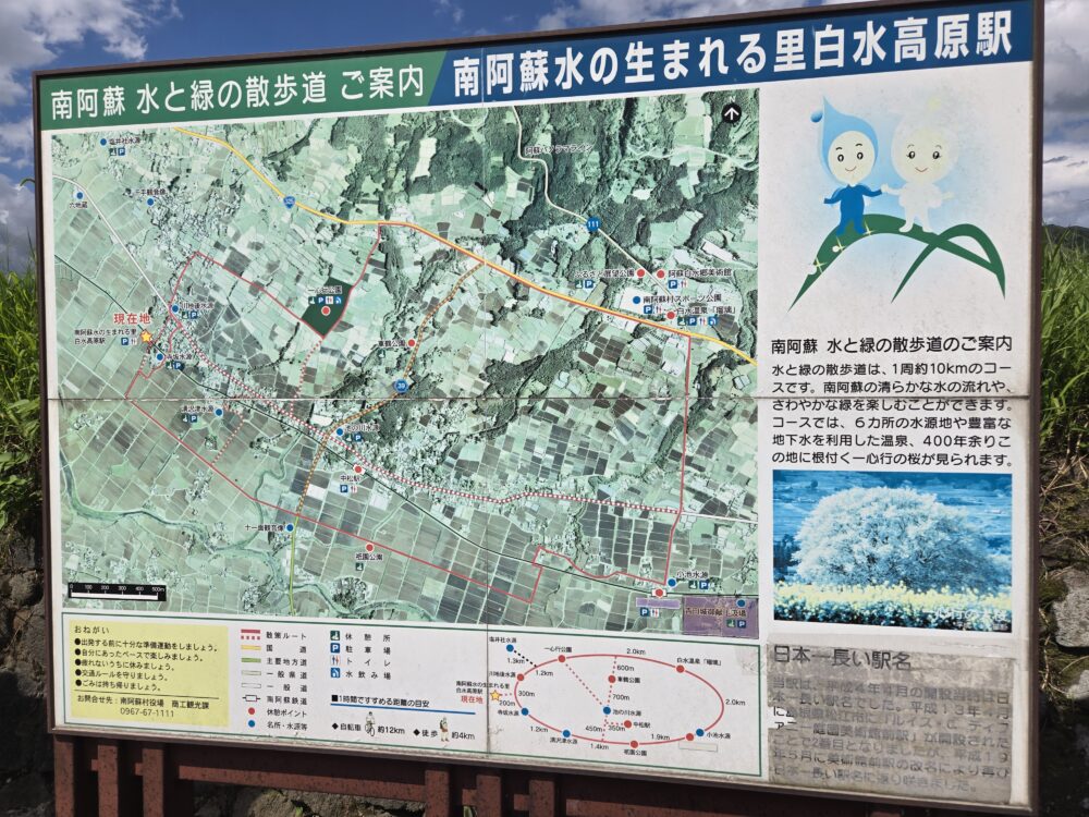 ここで前記事にも掲載した駅前の周辺案内図を再び。、右下部分から中央に目をやっていただくと周辺にはさまざまな水源があることが分かる。先に掲載したグーグル地図でも、そのあたりはよく分かる「南阿蘇水の生まれる里」のゆえんである