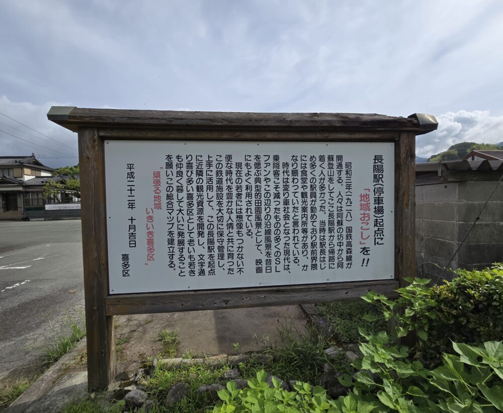 平成の大合併で南阿蘇村が誕生するまで所在地は長陽村だった。長陽村は明治の町村制施行の際、長野村、河陽村、下野村の3村が合併してできた自治体。見て分かる通り合成地名である。阿蘇山の地形の関係で、この付近は日照時間が長いことも影響しているという。南阿蘇鉄道の誕生時には、当駅のほかにも加勢駅、阿蘇下田(現在の阿蘇下田城)駅そして立野駅と4駅もが村内にあった。立野はすでに紹介した通り、豊肥本線との接続駅で、長陽村から南阿蘇村となった今も「特急が停まる村の駅」だが、かつて大津町の誕生に参加した瀬田村の一部で、その際に立野地区だけが長陽村に入ることになった経緯がある。場合によっては村への特急停車はなかったかもしれない