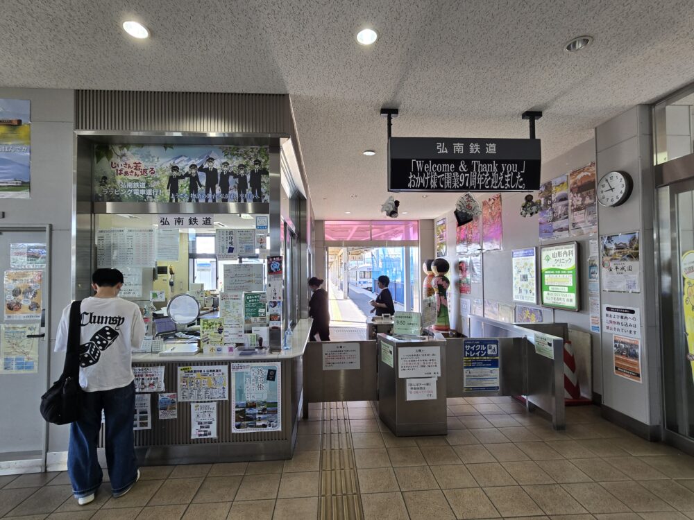 電車の到着に合わせて改札口を開放するスタイル。待合所は改札の外にある。この後、体験するのだが、弘南線の有人駅各駅がそのシステムをとっていた
