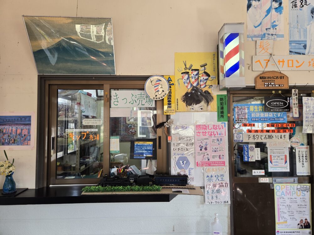 入居する理髪店が営業している時間帯はきっぷ販売も行う。カタカナの「キップ売場」の文字がなかなかいい