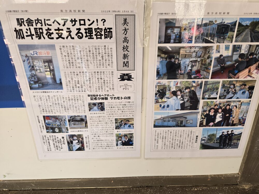 駅舎内に2022年の美方高校新聞が張られていた。これだけで歴史が分かるようになっていて、とても優れている。理髪体験記まであって完成度も高いし、上から目線に感じられてしまうと申し訳ないが、長らく記者をした私が高校生の時には、これだけの原稿はとても書けなかったと思う