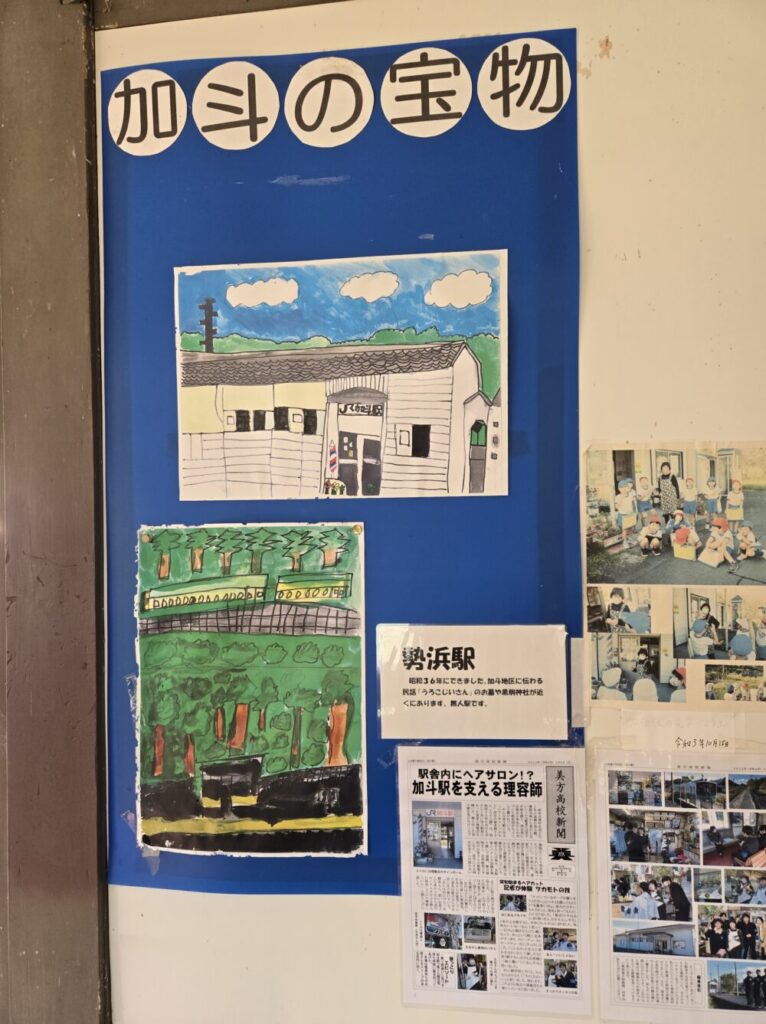 同じ場所には「加斗の宝物」と書かれた絵が張られていた。当駅とお隣の勢浜駅が旧加斗村の村域にある駅。ただ勢浜駅は小浜市になってからの開業だ