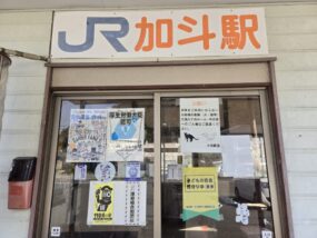 あらためて加斗駅駅舎。加斗という地名は加斗庄という荘園から来ていて鎌倉時代にはすでにあっという。明治の町村制施行で加斗村が誕生し1955年(昭和30)から小浜市。駅舎はおそらく1921年(大正10)の開業時からのものだ