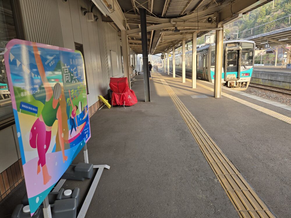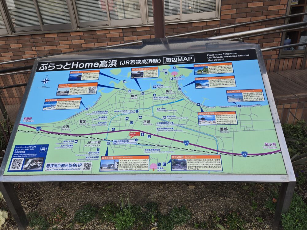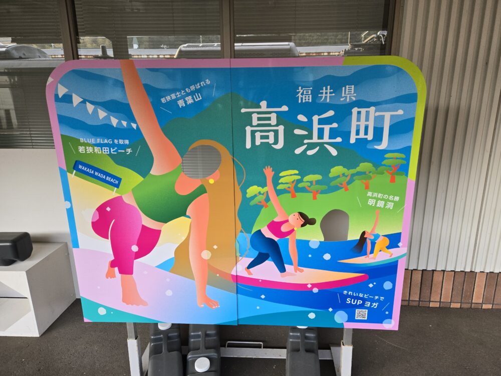 観光名所の入った顔出しパネルのお出迎え。駅名から想像できるように高浜町の代表駅である