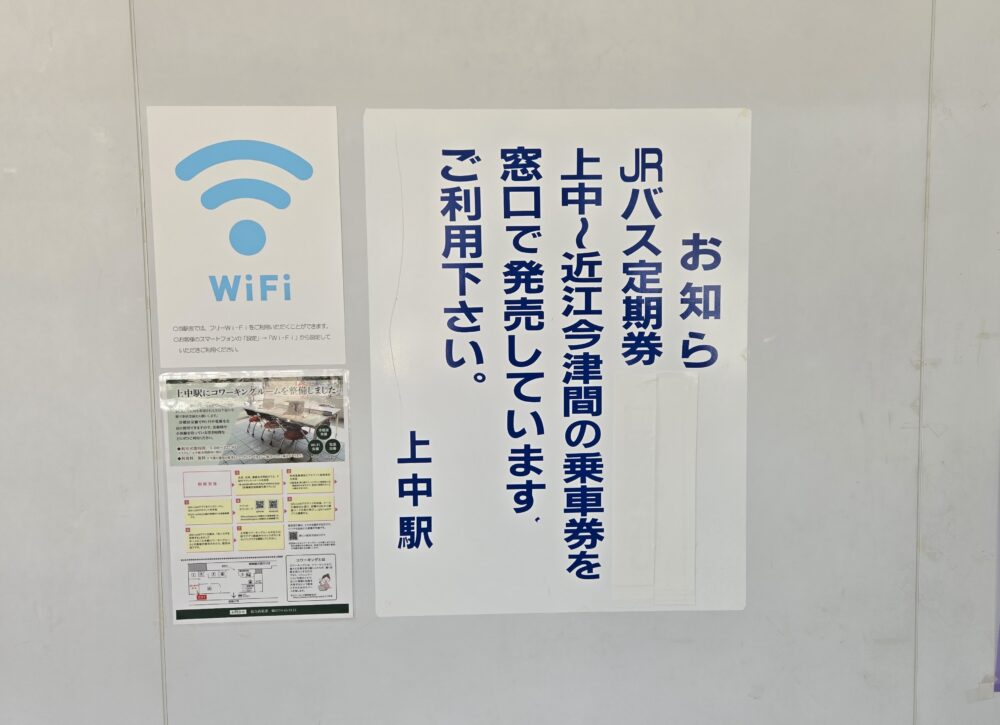駅舎内には西日本JRバスの運行する若江線(じゃっこうせん)の時刻表がある。お昼前から夕方にかけて1時間に1本。湖西線の近江今津駅から上中駅を経由して小浜駅とを結ぶ。運行時間帯だけを考えると小浜線より本数は多い。そして路線バスをJRが運行しているのがポイントでもある