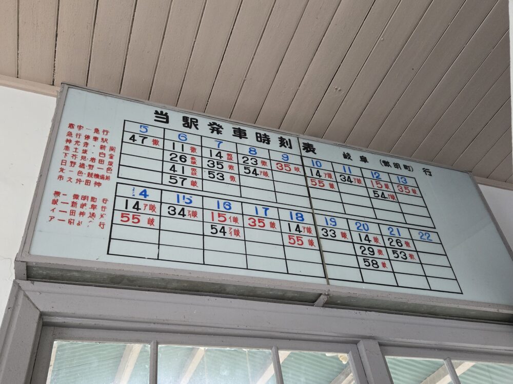 駅舎内にはきっぷ売場がそのまま残され、かつての時刻表も掲げられている。ただこれは廃線時のものではない。急行運転はかなり以前に廃止され、運行も基本的には当駅~新関と新関~新岐阜が分断されて美濃駅から新岐阜への直通運転は激減していたからだ。それを考えると1970年代の時刻表ではないかと思われる。廃線時の時点でも20年以上前のダイヤだと思われ、よく残っていたと感心してしまう