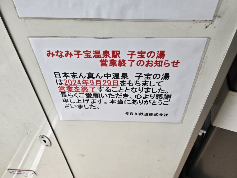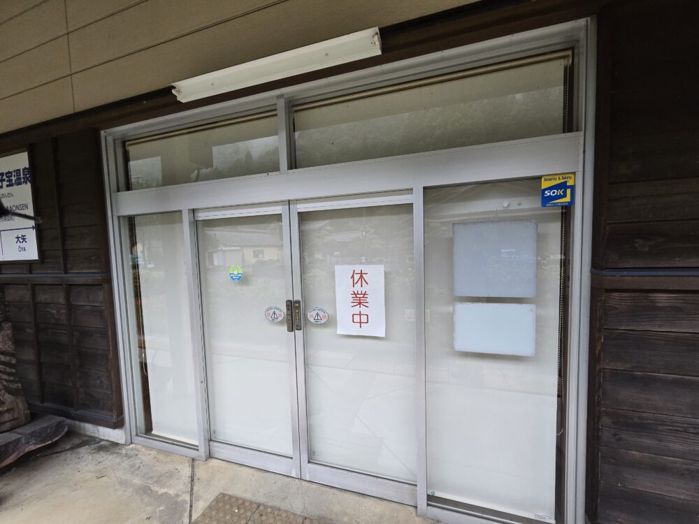 入り口には休業中の張り紙。カーテンで閉ざされていた。つまり温泉には入れないということだ。コロナ禍で利用者が激減したタイミングで燃料費が高騰。また老化に伴う施設の改修費に多くの費用がかかることから2024年に閉鎖となった。すでに美並村は平成の大合併で郡上市になっていた