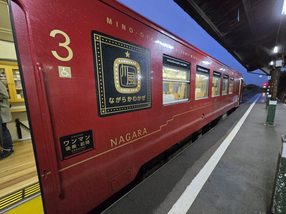 みなみ子宝温泉駅を出て美濃白鳥駅に着くころには日暮れの迫る時間となっていた。17時半。乗車列車は観光列車「ながら」の車両