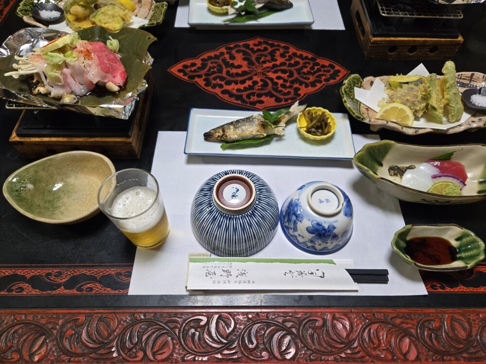 旅館でおいしく夕食をいただく。ちなみに夕食前に徒歩10分ほどのスーパーへ夜食の買い出しに出かけると滝のような雨に見舞われた