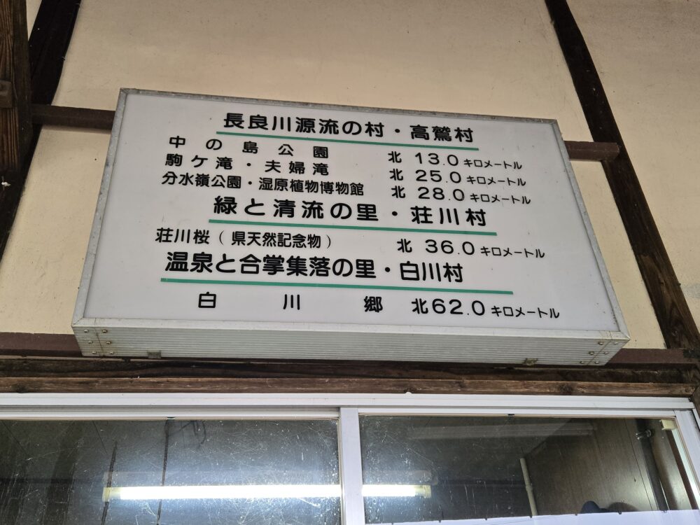 国道でも東海北陸自動車道でも約1時間。鉄路だと美濃太田から美濃白鳥までが66キロなので、白川郷までの中間点ということになる