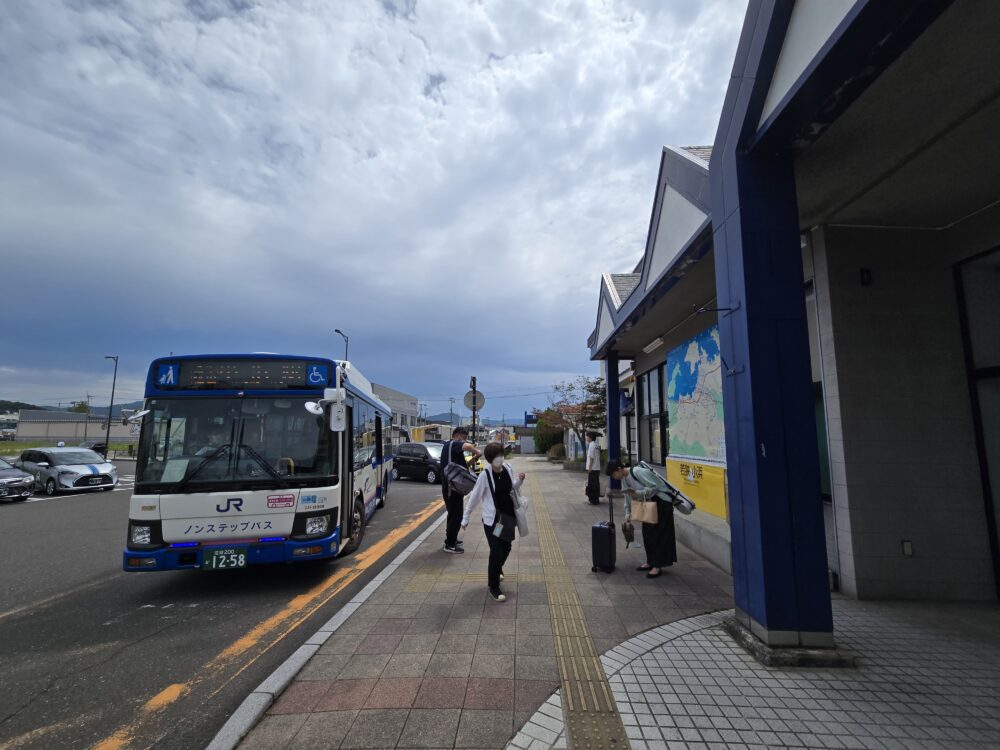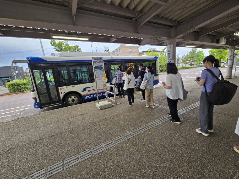 バスに乗車。10人ほどの並び客とともに乗車。平日や時刻、繁忙期などそれぞれの事情に分かれた利用者数は分からないが、土曜日の朝としては人が多い方ではないだろうか。当然座れた
