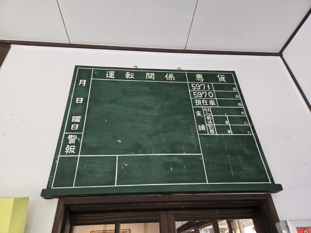 貨物で栄えたことを示す黒板が残るが、金額が記入されていたのだろうか。ただ一般の旅客に見えるように掲示するものではないので、駅舎に眠っていた業務用のものがこうやって掲示されていると思われる