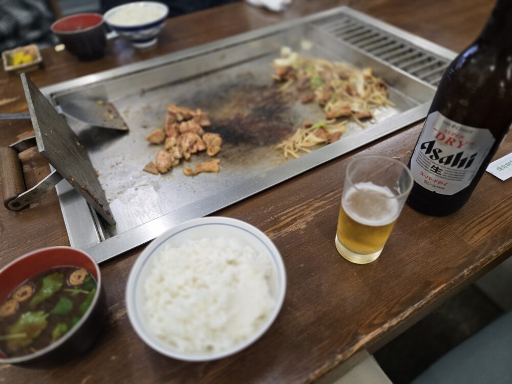 美濃市駅訪問の後はランチタイムとなった。当駅より北に進むとお昼を食べられる確証のある場所は郡上八幡までないこともあるし、そもそももう13時半。地元のソウルフードでもある「とんちゃん焼き」をいただくことに。特製のタレに漬け込んだ豚モツをジュージュー焼く。同時に鶏を漬け込んだ「けいちゃん焼き」も注文してシェアしていただいた。行列のできる人気店だそうだが、遅い時間なのですんなり入れて幸運だった