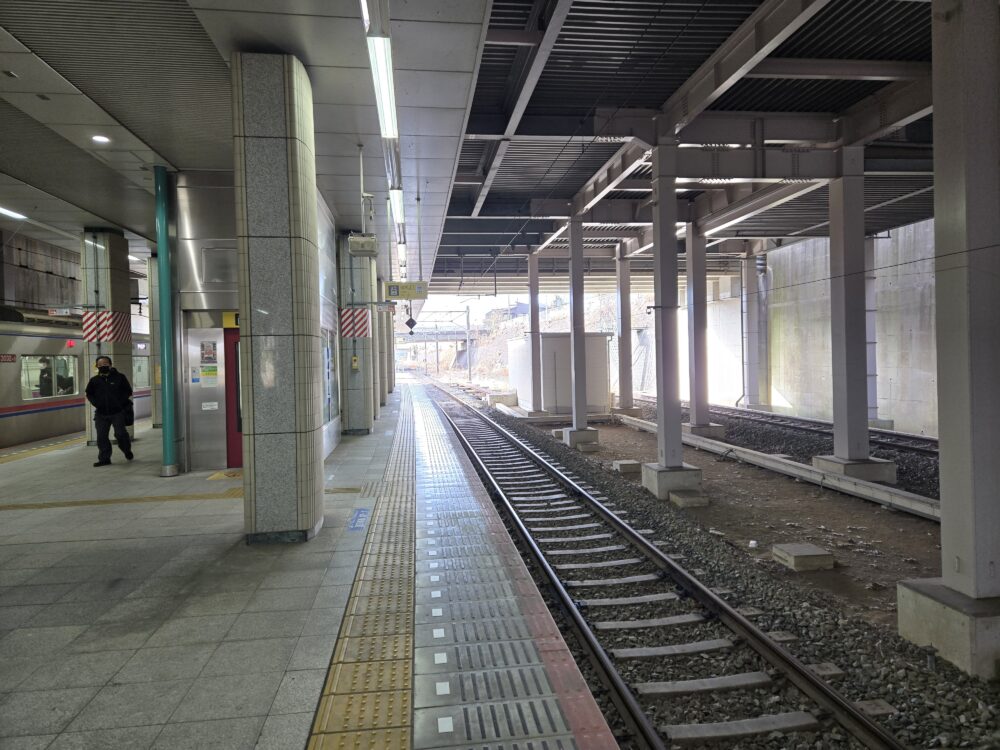 島式ホームで到着した列車は折り返していくが、右側にスペースと線路が見える
