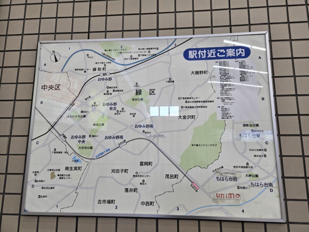 そのちはら台は市原市と千葉市にまたがるニュータウン。前記事の「生実(おゆみ)」とは異なり、新しく作られた地名。ひらがなだとピンと来ないかもしれないが、乗車してきた京成千原線の漢字表記を見れば分かる。「千葉」と「市原」にまたがるので「ちはら」となった