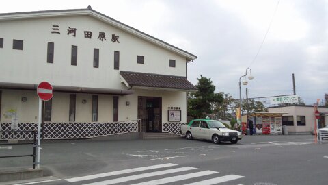 杉山駅の時と同じく当時の携帯の写真ではこれ以上大きくするわけに行かないが、2012年の訪問時の三河田原の駅舎は現在とは全く違うものだった。駅舎の位置は線路の北側にあった。タクシーが停まっているところをみると、それなりの需要があるのだろう。ちなみに2023年度の1日あたりの利用者数は2306人で全体の5位。利用者1000人を超える駅は7駅しかなく、うち6駅が豊橋市に所在していることを考えると、規模が分かる。田原市の代表駅でもある