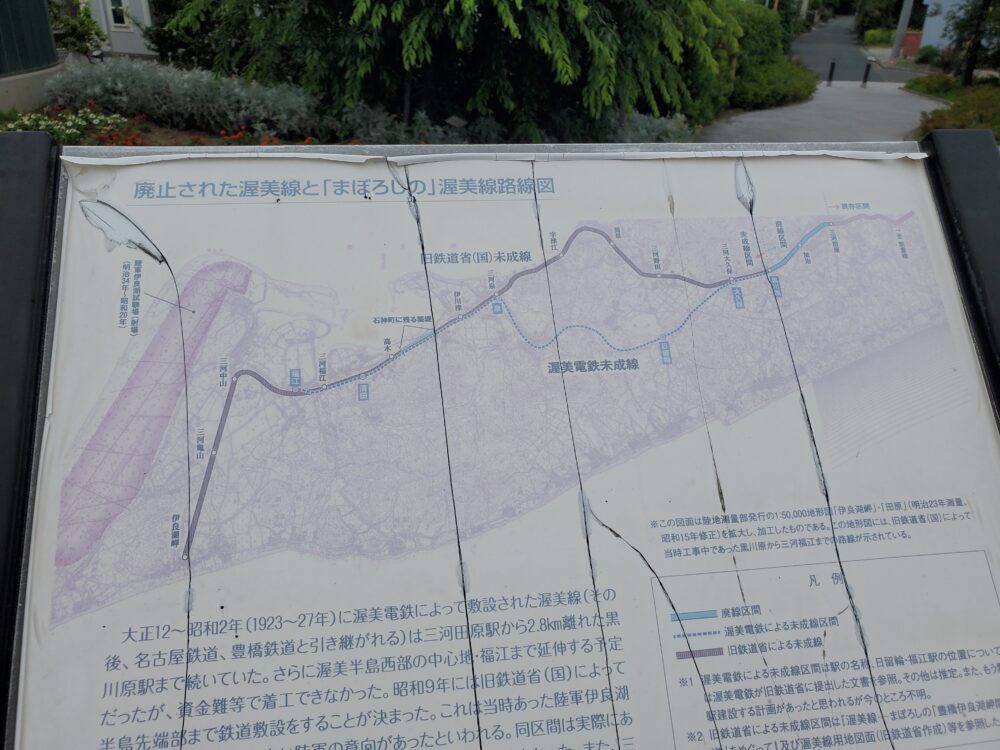 渥美線の歴史を記した解説板があり、予定されていた伊良湖岬への路線図と駅名。今も残る未成線の路盤の場所も記され、これが後にバスに乗る時、大いに役に立った