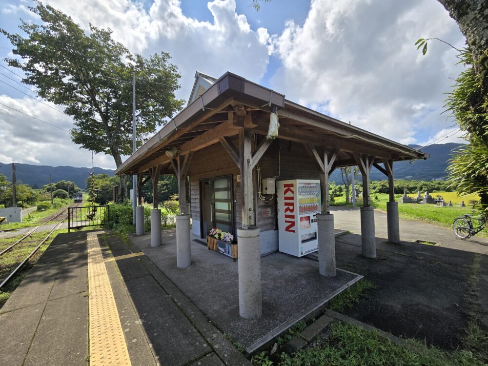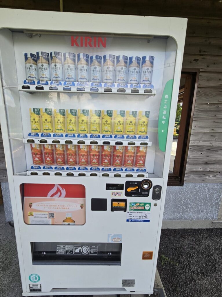私が当駅に滞在できる時間は20分。外の写真は撮ったので、駅舎内を見る前に暑いので何か買おうと駅舎横に設置されている自販機に近づいてみて驚いた