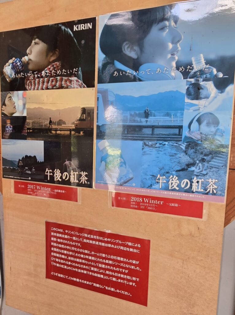 この駅は午後の紅茶のCM撮影地だったのだ。熊本地震からの復興支援として当駅周辺で上白石萌歌さん主演のCMが撮られ、自販機はセットの一部として設置されたものが、そのまま利用されているものだという