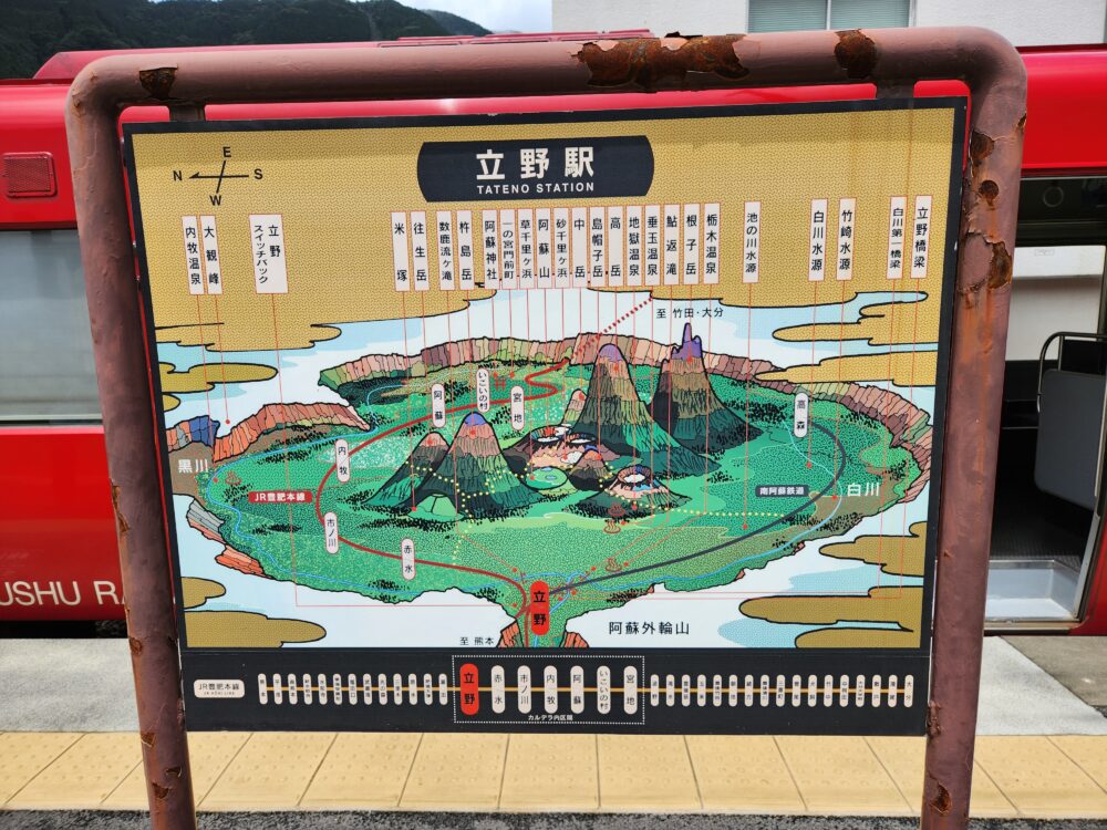 こちらは立野駅のホームにあるイラストだが、阿蘇山を囲むように敷設されていることが分かる。豊肥本線と高森線が計画され、豊肥本線は大分へ高森線は高千穂を経て宮崎県の延岡へとつながる予定だった。ただ豊肥本線は高森まで線路が到達した1928年に全線開業したのに対し、高森線と接続予定の高千穂線は1935年の一部開業から戦争をはさんでジワジワと延伸が続けられ、1972年に高千穂まで到達。以降も高森まで延伸すべく工事は続けられたものの、県境を越える長大トンネルを造ることができず、それぞれ高森、高千穂が終点の盲腸線となってしまった