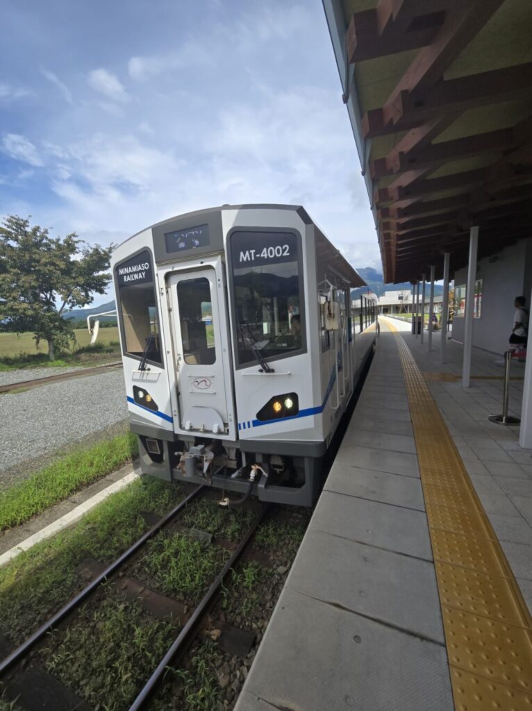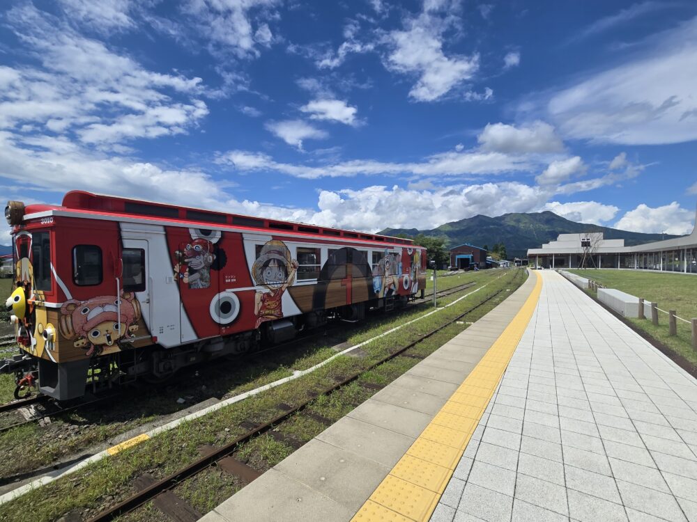 ワンピースのキャラクターによるサニー号トレイン。こちらもカメラの放列。ワンピースの作者尾田栄一郎さんが熊本出身という縁で全線復旧となった2023年から運行を開始。主に週末に運行されていて私が訪れたのは平日だったので留置線で休憩中だった。1日1往復と2往復の日があり、2往復の場合は1往復が全席指定となり、指定席料金510円が必要。それ意外の便は全席自由席で乗車券のみの追加料金不要となっている。運行日など詳細は南阿蘇鉄道HPを参照していただきたい