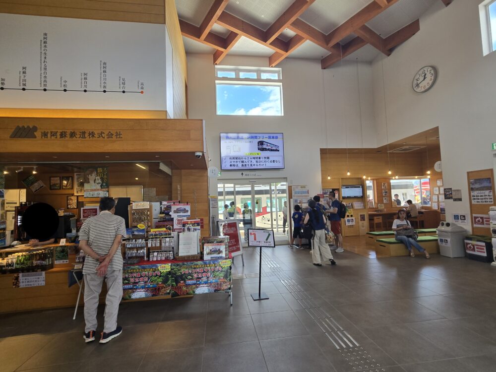 開放感のある駅舎内はエアコンも完備。休憩スペースには充電コーナーもある。南阿蘇鉄道が入居する路線内唯一の有人駅。乗車券の販売も行うが、改札業務は列車の乗務員が行うため、外からダイレクトにホームに入ることも可能で開放感が漂っている