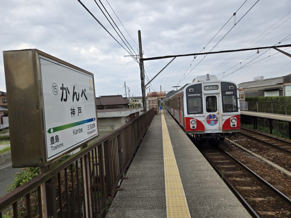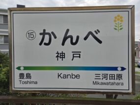 神戸駅に到着。こちらの駅名標も杉山駅と同じく厚みのあるものだ。そして見れば分かるが「かんべ」と読む。これまで記してきた通り、渥美線には「向ヶ丘」「豊島」そして、この「神戸」とどこかで見たような駅が存在する。全国の「神戸」については「かんべ」が多数派で、群馬県では「ごうど」があり、いずれも人名にもなっている。おそらく「こうべ」が最も少数派で、地方の小さな駅だったら、難読駅の常連になっていたかもしれない