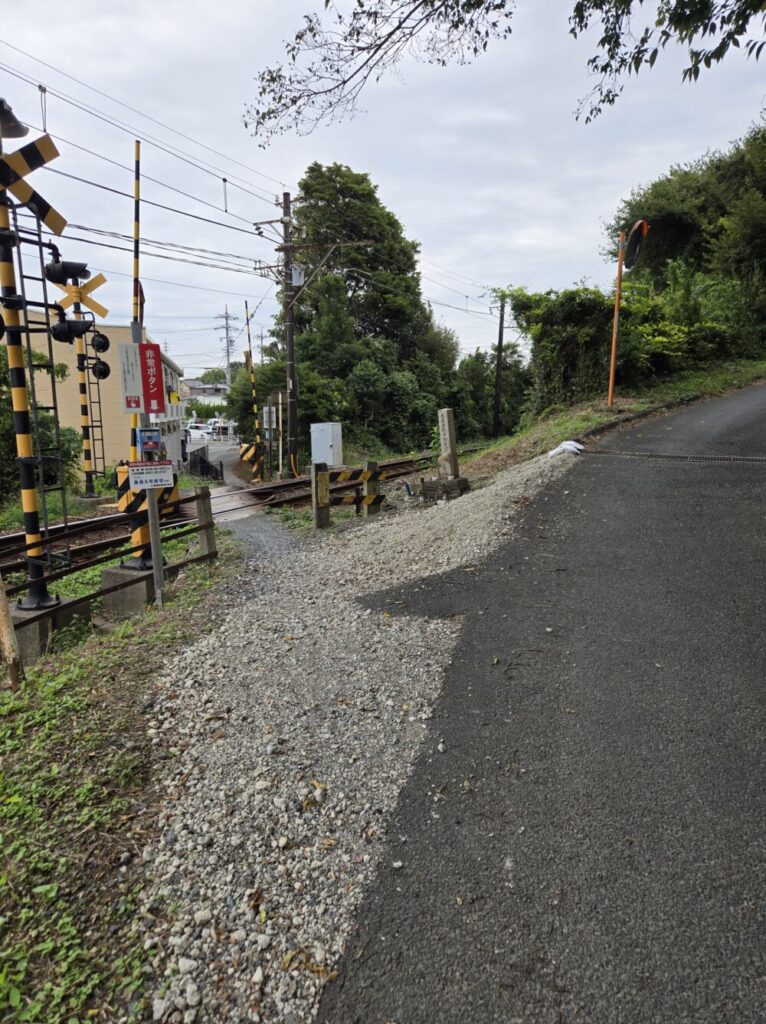 写真では分かりにくいが、小さな踏切の向こうはすぐ田原街道で家電量販店や自動車販売店、衣料品店、ファミレス、コンビニなどロードサイド店が並ぶ場所で、すぐ近くにある石碑の存在感が際立っている
