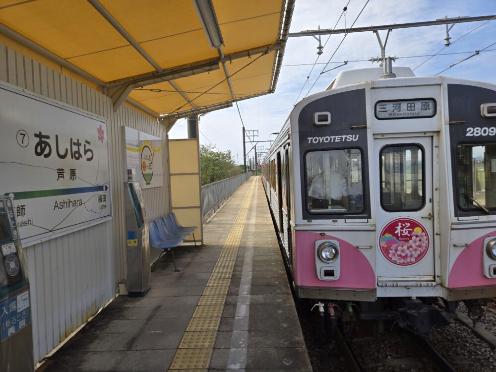 芦原駅に到着。高師駅をひとつ飛ばした形となる。豊橋市内だが、住宅地が目立った南栄駅とは一転、このあたりから農地も多くなってくる