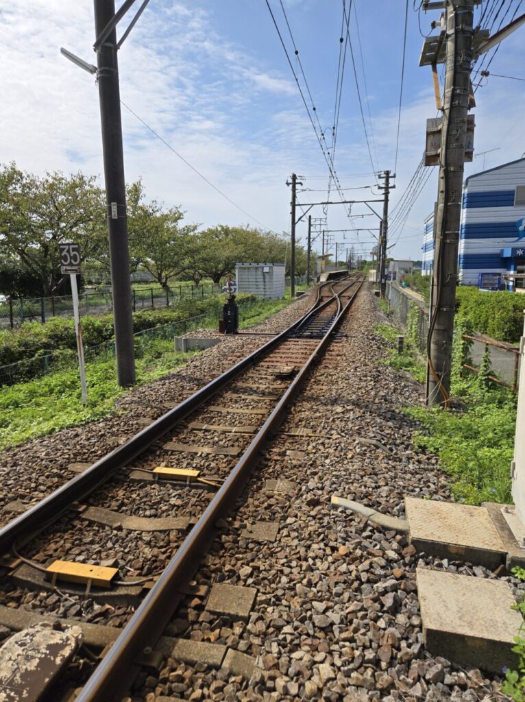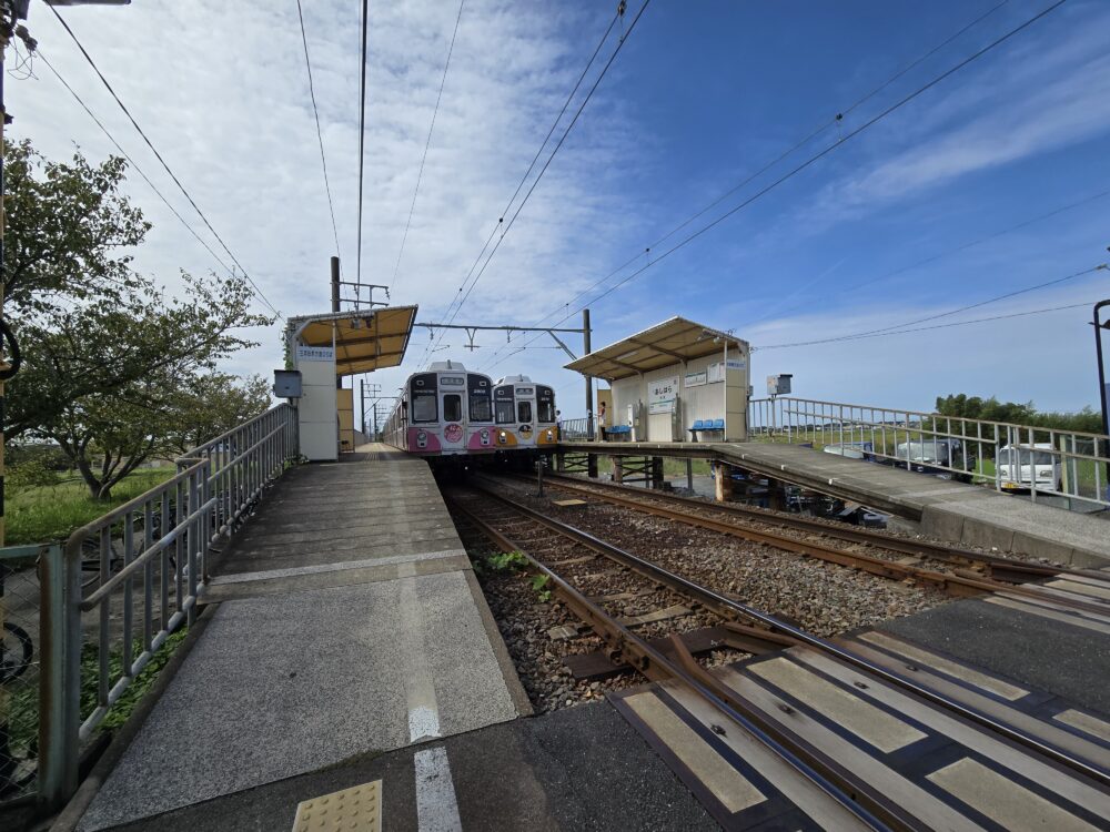 すれ違い可能な2面2線構造だが、このようにやや遠くから見ると左側のホームは、いかにも後から付け加えた雰囲気である。1985年(昭和60)に15分間隔の運行を行うにあたり、列車交換可能な形に「出世」した。ここまで紹介してきた市内中心部の駅の周辺は、すでに宅地や学校、道路で埋まっていて複線化しようにもスペースがなく、選ばれるのは郊外の駅が中心となる