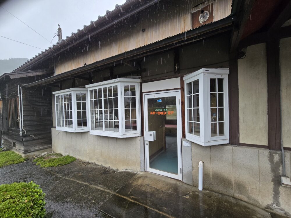 喫茶店の跡も。窓の造りがおしゃれな店舗だったようだが、10年以上前に閉店となり、そのままとなっている。駅そのものは国鉄時代の早い時期に無人化されている