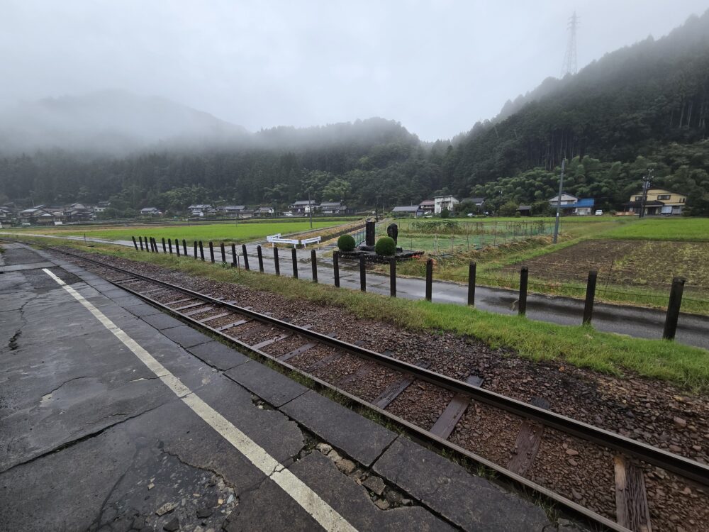 こちらはホームつまり駅舎と逆側の風景。石碑が気になったが、おりからの雨とホームの向こう側へは大回りをしないとたどり着けないので断念した
