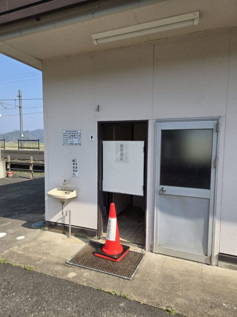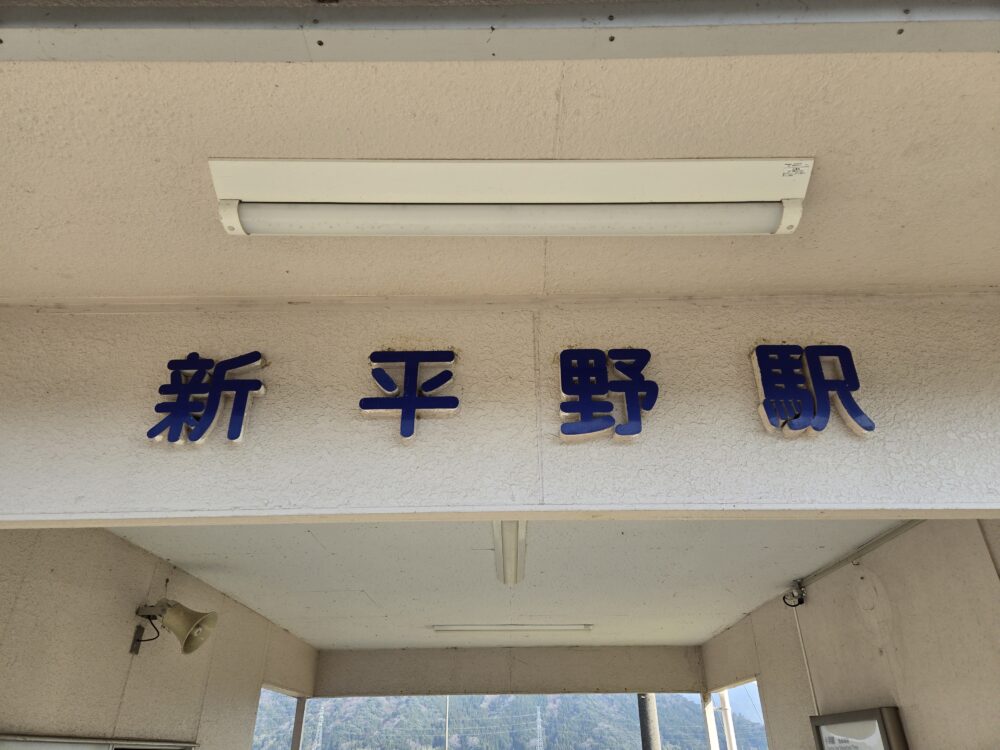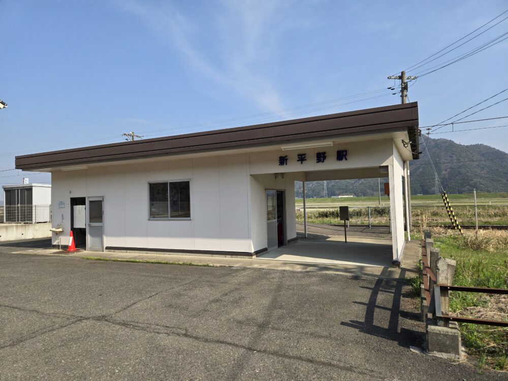 新平野駅に到着。ご覧の通りの簡易的なコンクリート駅舎。開業は1918年(大正7)で上中駅や大鳥羽駅と同じ。ここに線路ができた時からの一期生ということになる。かつては開業時からの駅舎があったようだが、JR移管後に現在の形となった