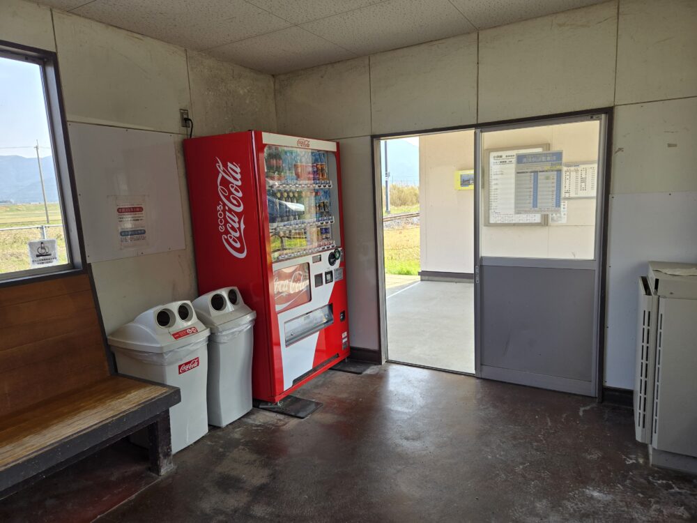 駅舎内には待合室と自動販売機。他駅ではゆっくりできなかったので熱い缶コーヒーを、と一瞬思ったが