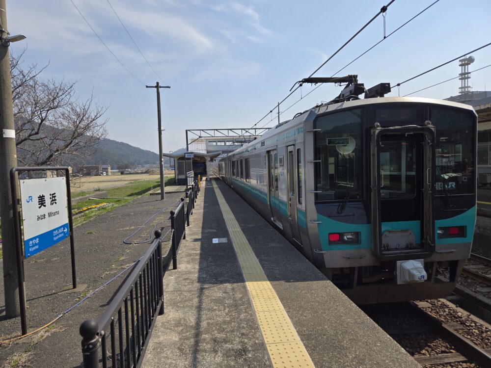 美浜駅に到着。小浜線の中では知名度が高い駅で、急行が走っていた時代は停車駅でもあった。今も主要駅のひとつで、当駅で列車交換が行われることが多い