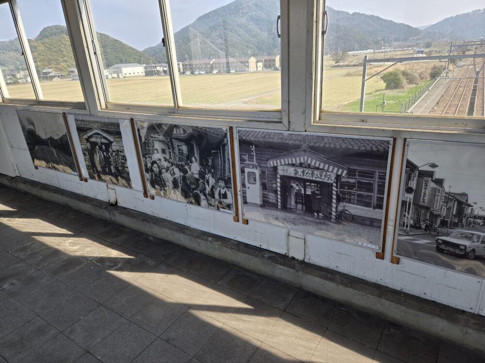 駅の跨線橋には、かつての駅の写真が飾られている。「祝 気動車運転」で昭和36年と記され、SLからの無煙化が始まった時のもののようだ。60年以上前のこの時点で既に年季の入った木造駅舎だったようだが、1967年にいわゆる国鉄型コンクリート駅舎へと建て直し。2003年(平成15)にさらにリニューアルされ