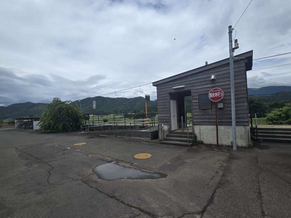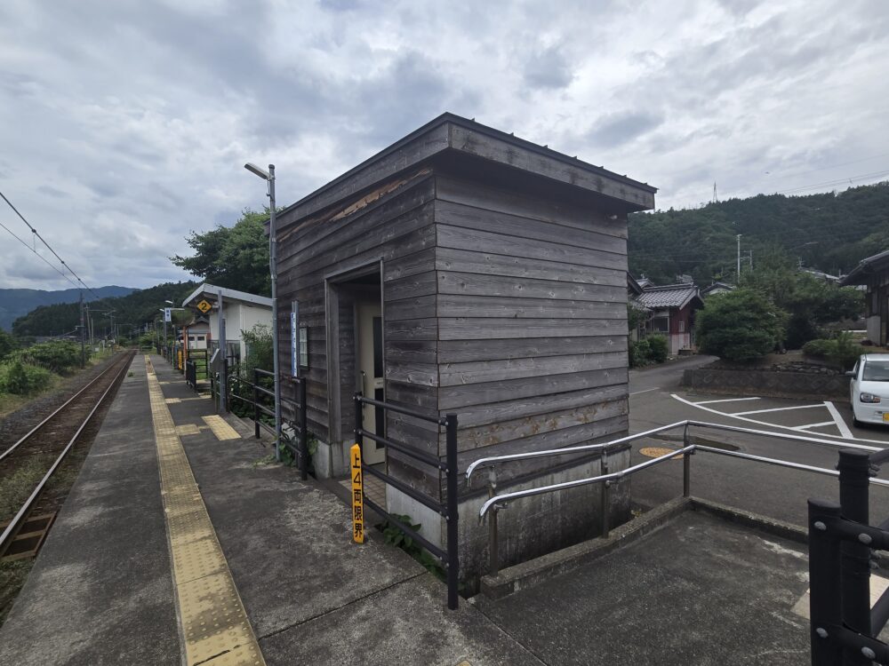 ホームから通り抜けも可能になっている木造の建築物、これはお手洗いだ。ホームからの景観を損なわないようにしているのだろう。いかにもお手洗いという形はしていない。これはなかなかの気遣いだと思うし、やはり駅にお手洗いがあるのはありがたいことだ