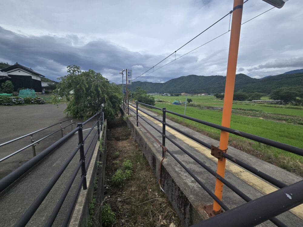 ホームの構造は独特でホームと広場の間にスペースがある。将来的にすれ違い可能な島式ホームを構想していたようにも見えるが、そうすると大きな駅前広場も説明がつく。ホームの向こう側には農地が広がる。とはいえ2023年度の1日あたりの利用者数は110人と3ケタの数字がある