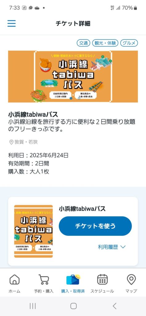 こちらの小浜線tabiwaパス。小浜線内にはIQ乗車もないし、自動改札機も始発と終着駅のみしかないので駅員さん、またはワンマン運転士への提示式・JR西日本のtabiwaアプリから購入できる。2日間2200円で沿線の観光施設や飲食店でのサービス特典が付いている。敦賀~東舞鶴の運賃が1690円なので、1日1100円というのはなかなかお得。そもそも私は1日のみの利用だったが、2200円の元は十分にとれた