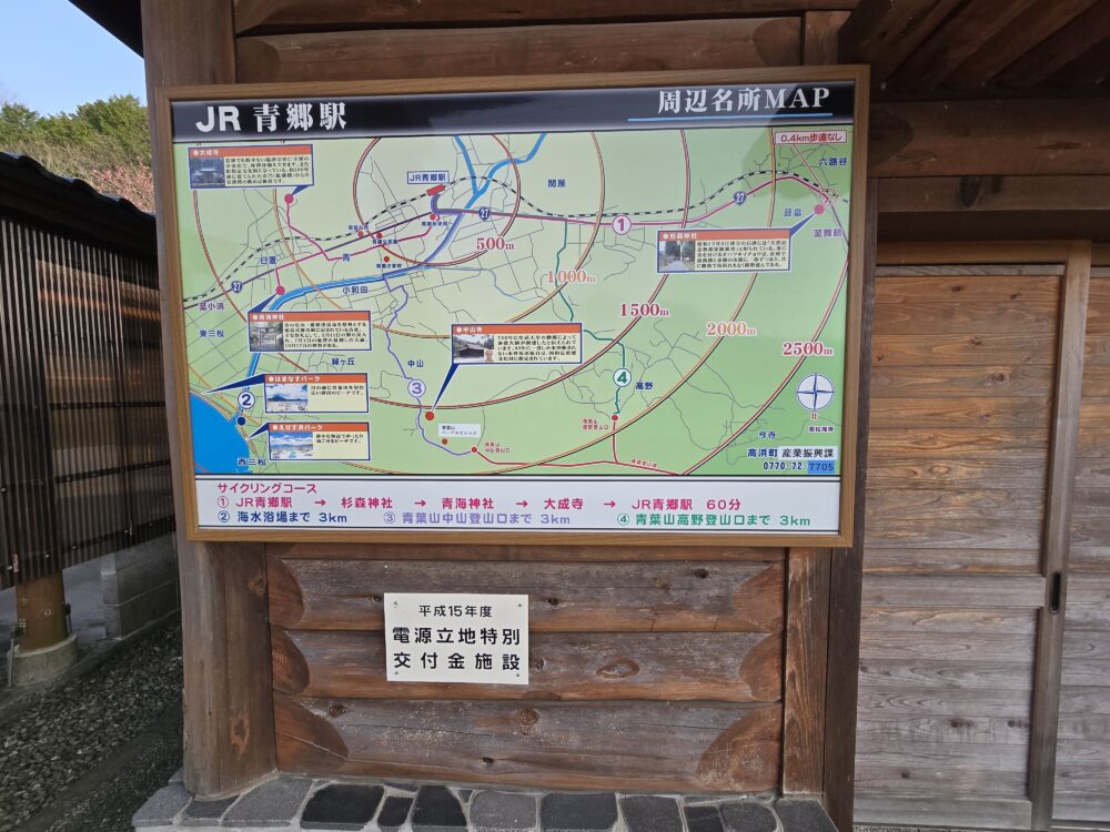 駅へと戻ると三松駅にもあった「電源立地特別交付金施設」(三松駅は電源立地地域という表記だった)の張り板。こちらについては前記事で自分の考えも述べたので、ここでは特に触れない