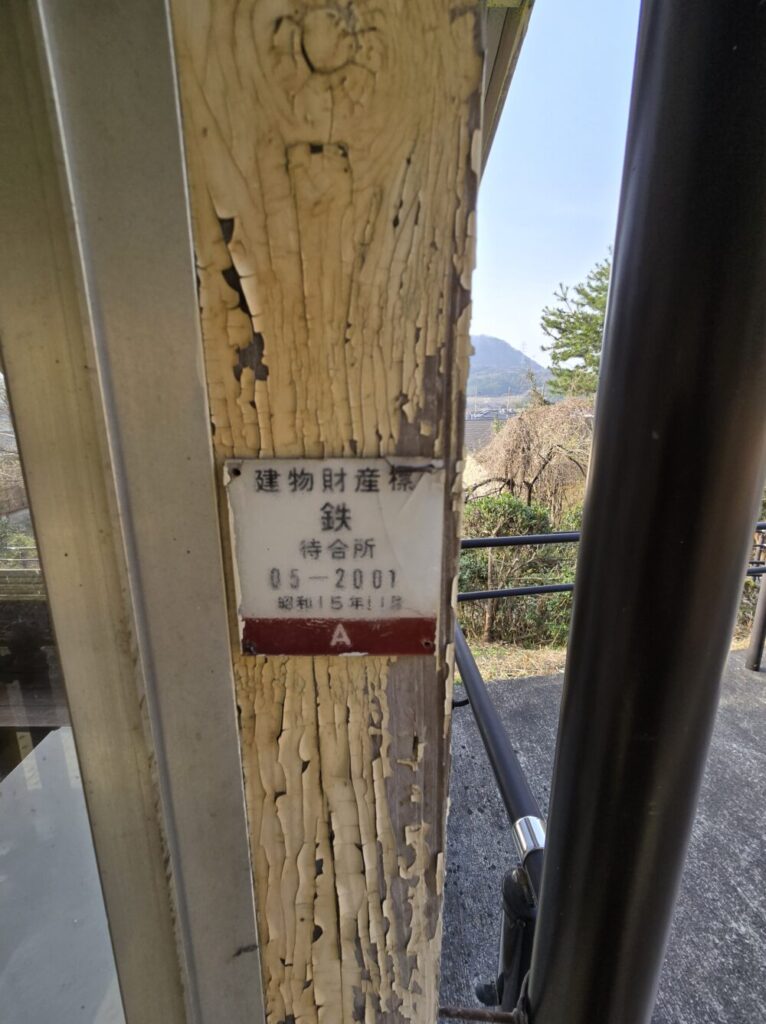 財産票はしっかり残されていた。駅の開業は昭和15年の11月1日なので、まさにこの駅と同じ歴史。この小さな待合所で85年前に列車を待った人と同じ空間を味わえようになっている