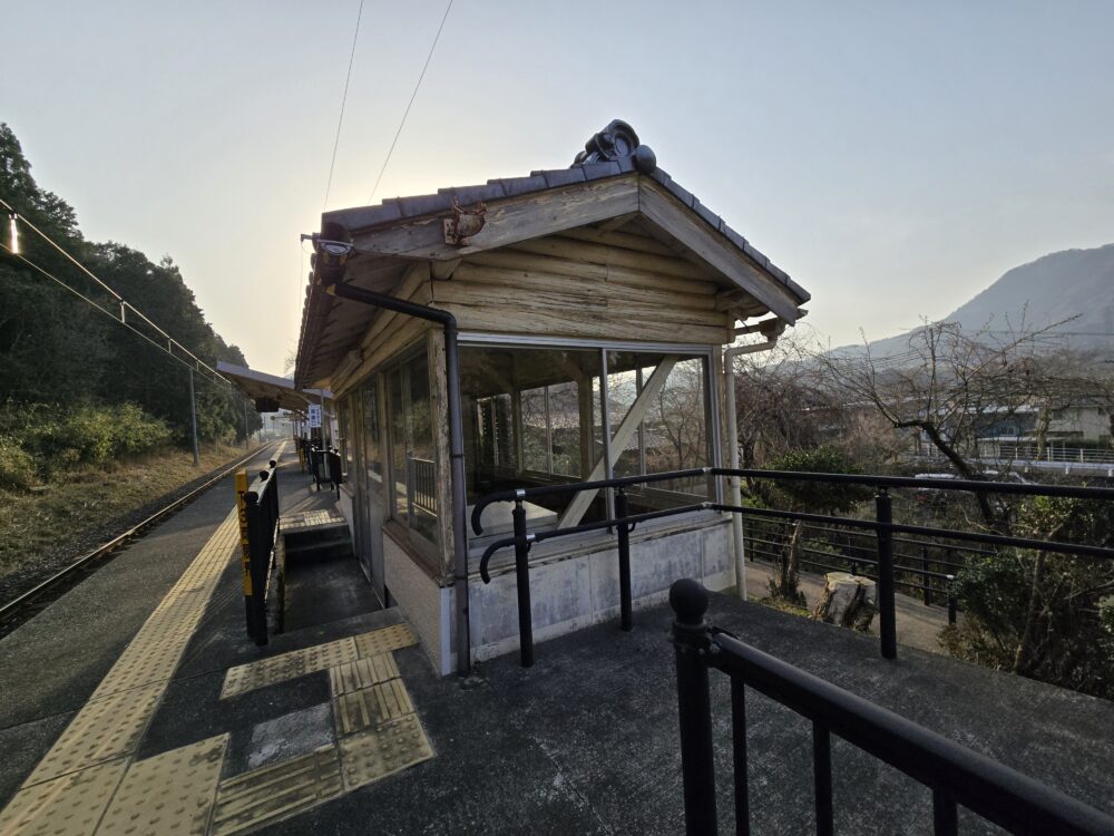 ホームにある瓦屋根の待合所。加斗駅で見かけたものと同じような造りだが、駅舎は生まれ変わり、ホームへの階段に立派な屋根ができても、こちらはそのまま。おそらく駅舎からホームに向かうには階段を昇る必要があるため、ギリギリにならないよう残されたのだろう