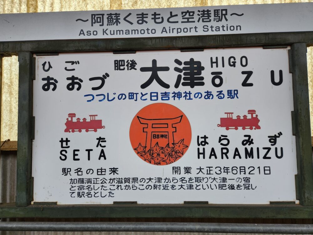 その肥後大津駅の駅名標がこちら(撮影は2023年)。町名の由来について記されているが、初めて来た時に滋賀県の大津が地名の由来と知って驚いた記憶がある