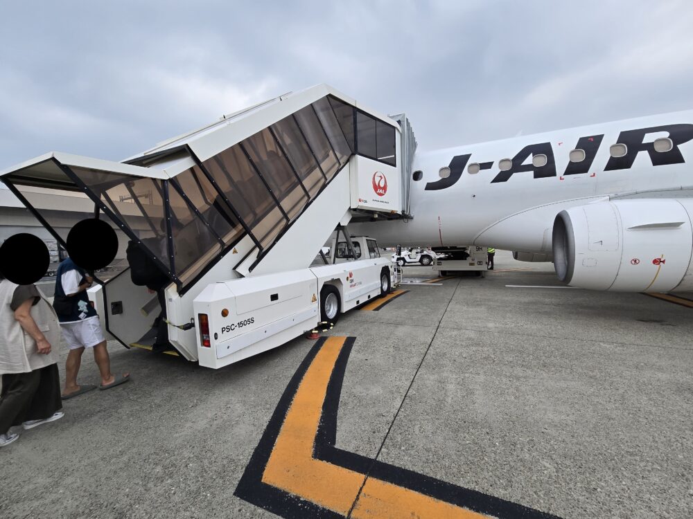 バスで飛行機の手前まで運ばれる形式。JALの場合、伊丹空港から地方に向かう便は結構この形式が多い。ただこの時点で私はため息まじりだった