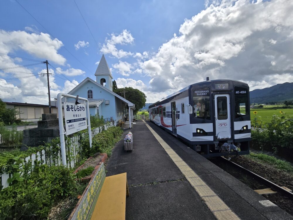 見晴台駅から立野方面へと折り返して阿蘇白川駅で下車。時刻は10時38分。当初の予定だと立野どころか、11時48分の列車に乗るべく、まだ肥後大津で待機中。「まだ」というより「まだまだ」だ。早めに着くのだから荷物をホテルで預かってもらって…などと考えていたが、飛行機の5分早着は本当に幸運、強運だった。全9駅(立野をのぞく)の南阿蘇鉄道において、もう2駅目なのだから、これは大きい